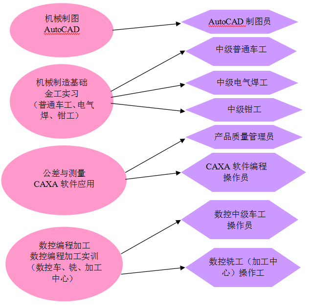 | 支撑实训项目 | 通用机械制造加工实训(含普车、钳工、电气焊等) 数控加工与编程实训(含数控车工、数控铣工、数控加工中心) 机械CAD/CAM实训(AOTOCAD和CAXA软件) |