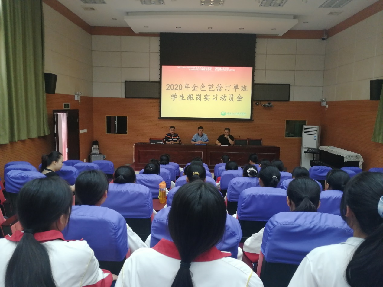 为贯彻落实全国职业教育工作会议精神,规范职业学校学生实习工作,我校深入学习贯彻习近平总书记关于教育的重要论述,加强以习近平新时代中国特色社会主义思想为核心内容的人才建设工作。近日,我校在校直录播室举办2018年金色芭蕾订单班、2018年三沙和订单班跟岗实习动员会。