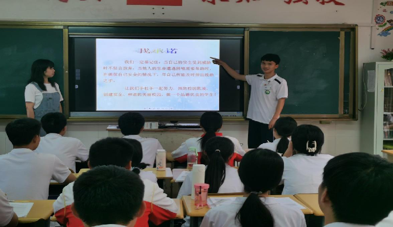 班主任赖德娟老师根据青少年的生理和心理特点,以网络中的真实案例为切入点,向同学们一一讲解校园欺凌。同学们在老师的讲解下,逐渐了解了校园欺凌的性质及其危害、如何预防和应对校园欺凌等相关知识,也明确了实施校园暴力需要承担的法律责任。最后,全班学生在杨军桥同学带领下齐声宣誓。19地铁安检班的“预防校园欺凌”主题班会在学生的宣誓声中落下帷幕。