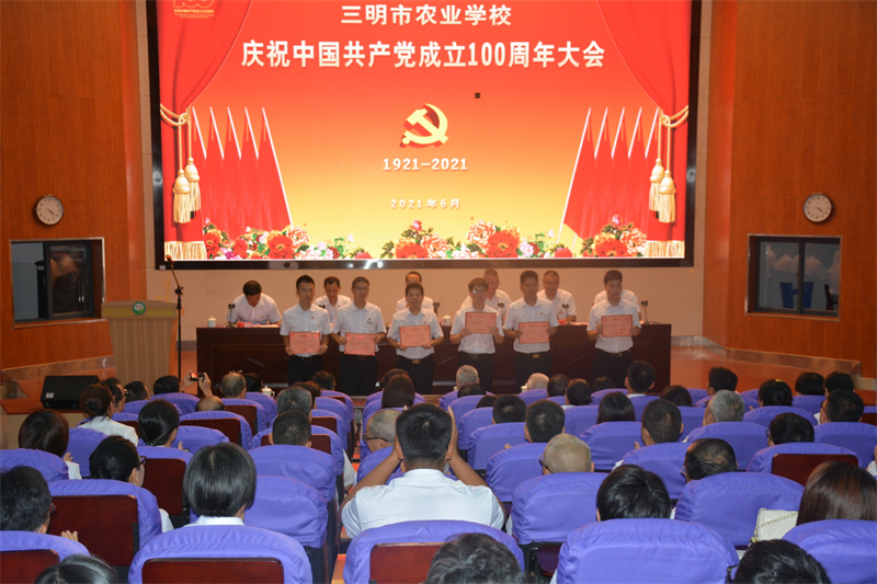 一是表彰先进,树立榜样。首先是向在推进学校教育改革发展、服务师生群众、增强凝聚力战斗力等方面作出了重要贡献,涌现出先进典型进行表彰。学校第一党支部被授予先进党支部,陈桂仙、官炳火、李万海等三位党员同志被表彰为优秀党务工作者,沈传文、黄晓斌、刘传杨、林烨龙、熊靖、吴维桂等六位党员同志被表彰为优秀共产党员。接着对参与学校庆祝建党100周年“永远跟党走 奋进新时代”晚会节目演职人员进行表扬;随后,为“学党史 明初心 悟使命”党史知识竞赛获奖者进行颁奖。