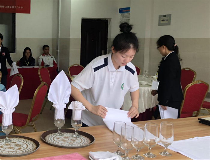 考试分为理论和实操两个模块。理论部分为闭卷机考,考察餐饮服务管理基础相关知识;实操部分则对中餐宴会摆台、口语和礼仪等职业能力方面进行综合考核,由考评员进行现场打分。考试前期,同学们刻苦训练,积极备考,考核现场沉着冷静、动作规范、大方自如,台面餐具、用具摆位整齐一致、美观,完美展示了酒店管理专业学生扎实的技能和良好的职业素养。整个考试过程纪律严明,秩序井然,考试顺利完成。