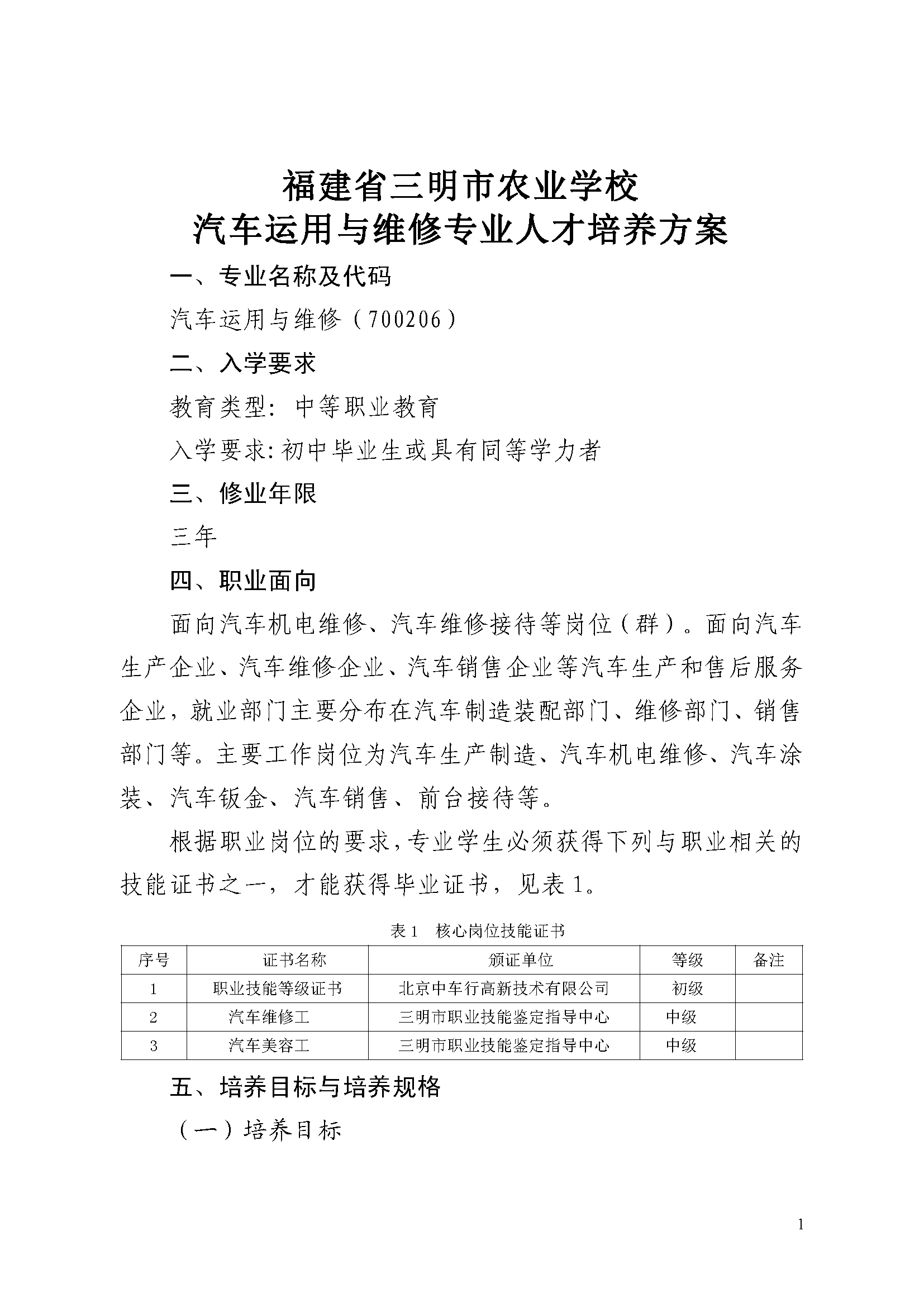 三明市农业学校汽车运用与维修专业人才培养方案(2023)